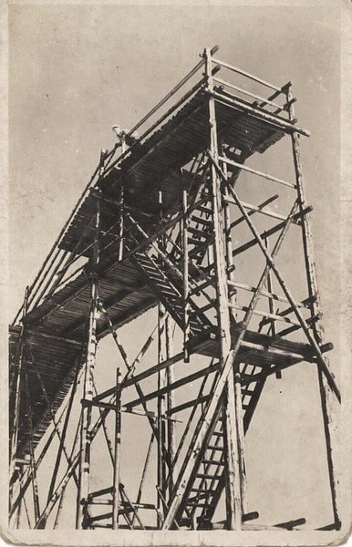 Dřevěná konstrukce skokanského můstku měla dva nájezdy. Jeden z vrcholu věže a druhý nájezd bylo něco níž, asi ze dvou třetin.